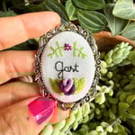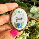 Brodée à la main et avec amour sur du coton bio, cette broche mesure 3 x 4 cm.