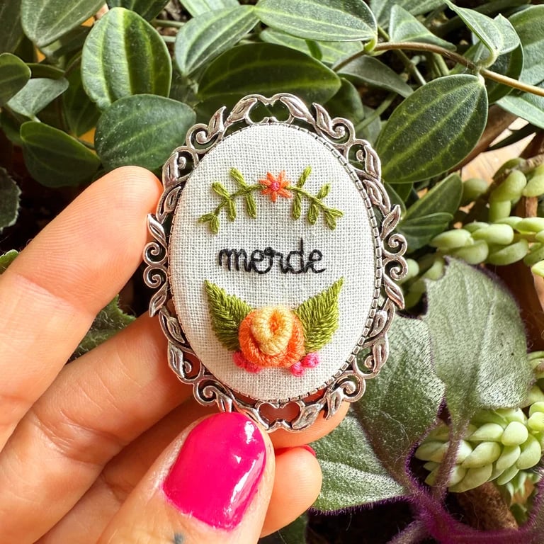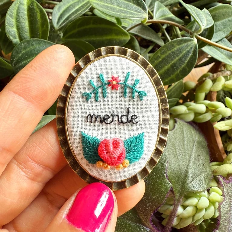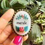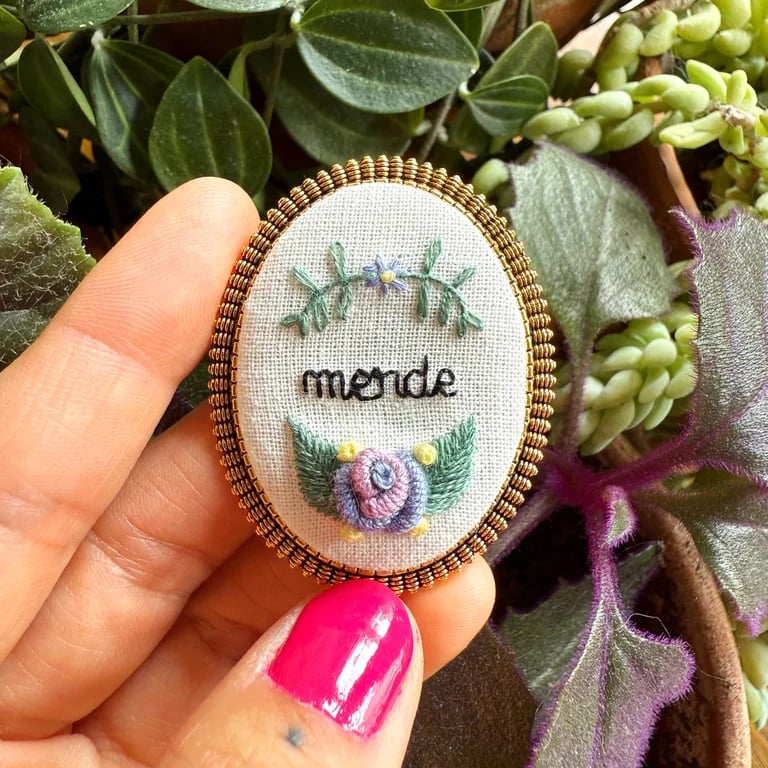 Brodée à la main et avec amour sur du coton bio, cette broche mesure 3 x 4 cm.