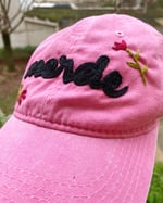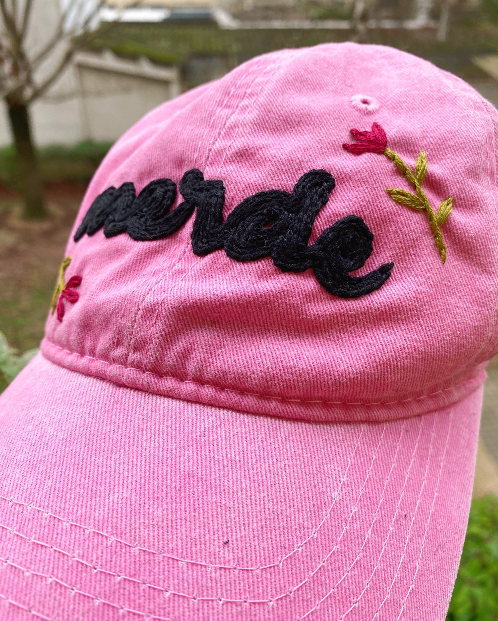 Brodé en point de tige sur une casquette rose en coton. Deux fleurs entourent le texte.