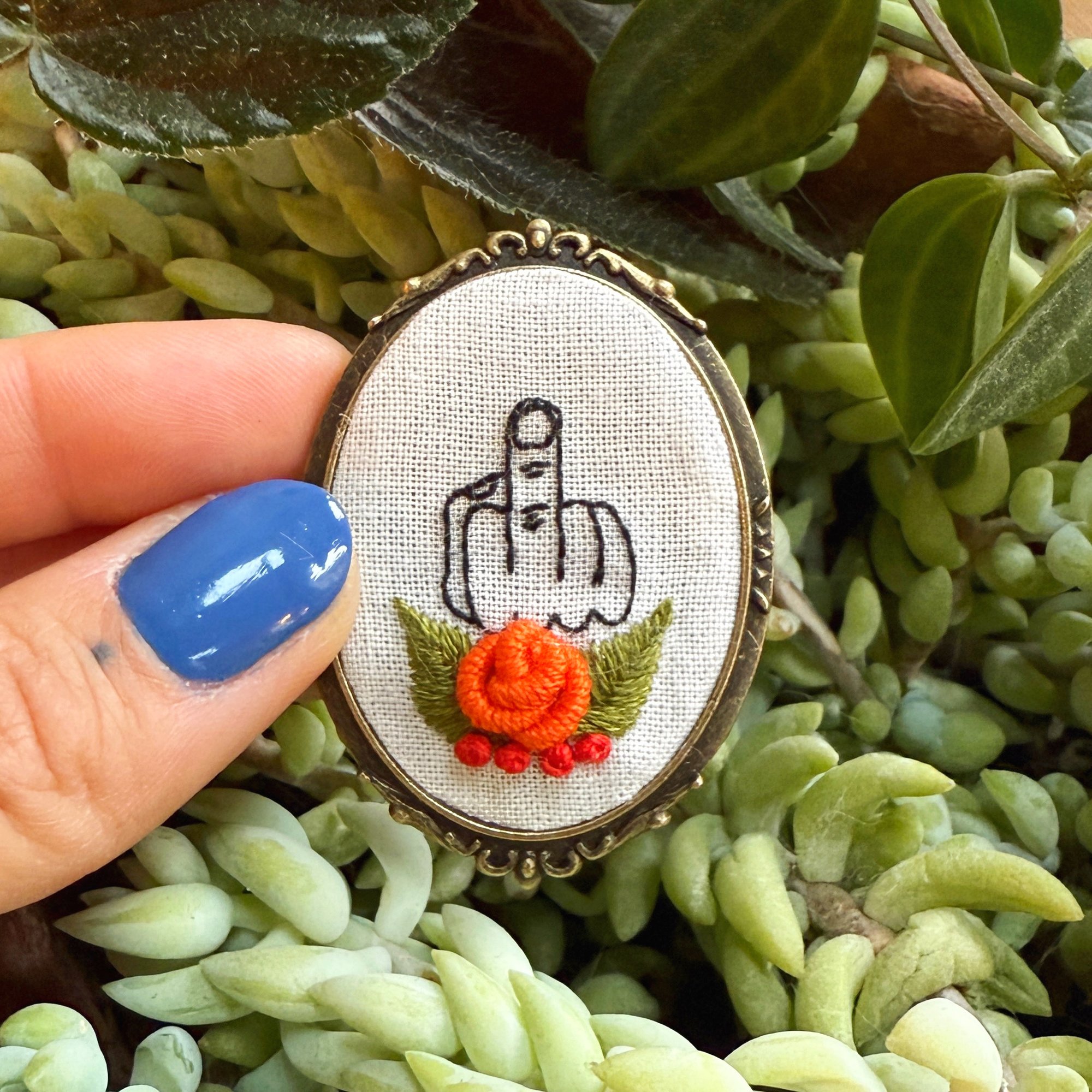 Brodée à la main et avec amour sur du coton bio, cette broche mesure 3 x 4 cm.