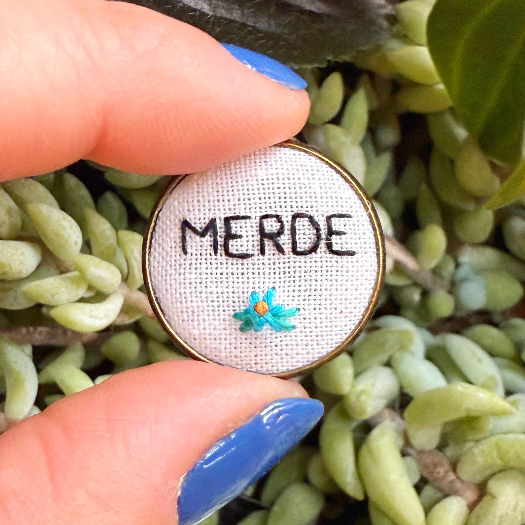 Brodée à la main et avec amour sur du coton bio, cette broche mesure 2 cm de diamètre.