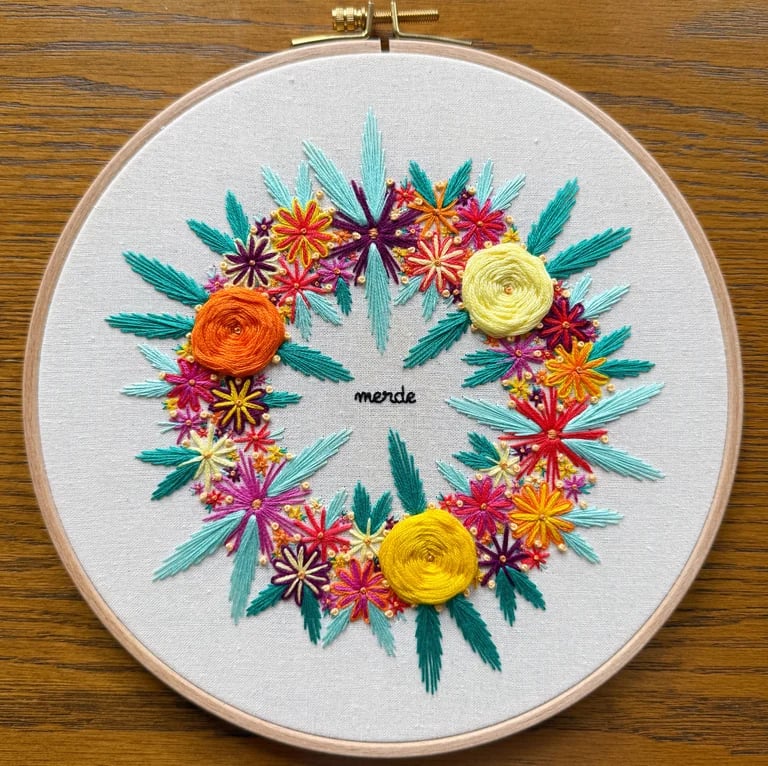 Brodé sur du coton bio, encadré dans un tambour de 22 cm de diamètre.